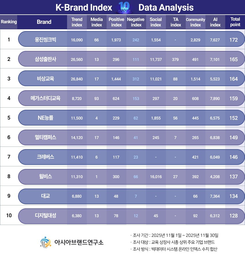 이번 K-브랜드지수 교육 상장사 부문은 교육 상장사 시총 상위 주요 기업 브랜드를 대상으로, 2025년 11월 1일부터 11월 30일까지의 온라인 빅데이터 36만 129건을 분석했다.