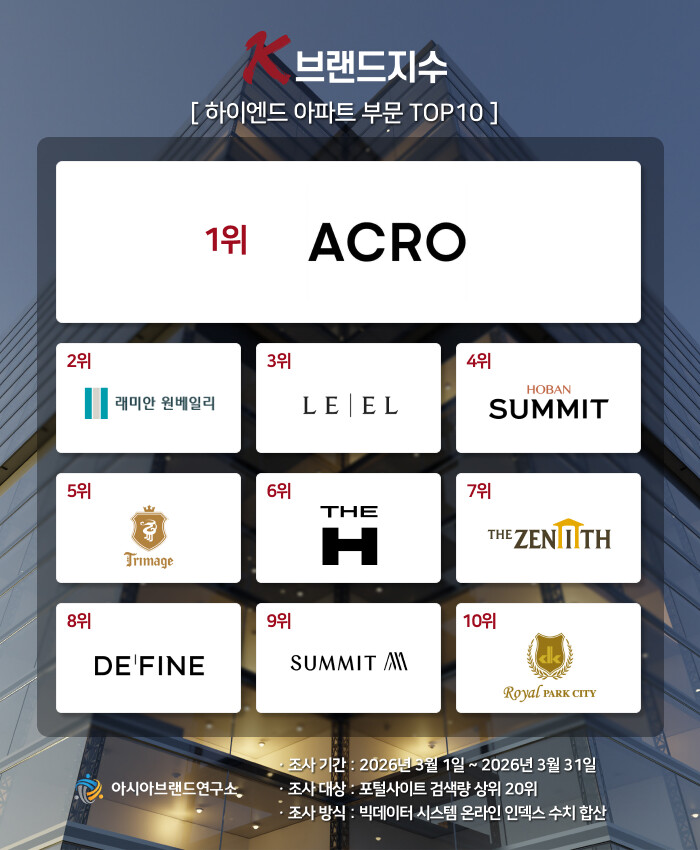 한정근 아시아브랜드연구소 대표는 “이번 K-브랜드지수는 부동산 시장의 양극화가 심화되는 가운데, 자산가들의 선택을 받는 초프리미엄 주거 브랜드의 견고한 가치가 빅데이터에 반영된 것으로 풀이된다. 특히 아크로의 1위 탈환과 원베일리의 2위 도약은 가장 눈에 띄는 대목이다. 기존 선두권이었던 르엘과 디에이치의 순위 하락은 하이엔드 시장 내 치열한 주도권 경쟁을 드러내는 흐름”이라고 설명했다.
