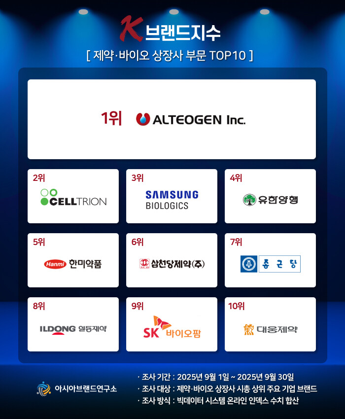 K-브랜드지수 제약·바이오 상장사 부문은 알테오젠이 1위를 수성했으며, 셀트리온(2위), 삼성바이오로직스(3위), 유한양행(4위), 한미약품(5위), 삼천당제약(6위), 종근당(7위), 일동제약(8위), SK바이오팜(9위), 대웅제약(10위) 등이 TOP10에 이름을 올렸다.
