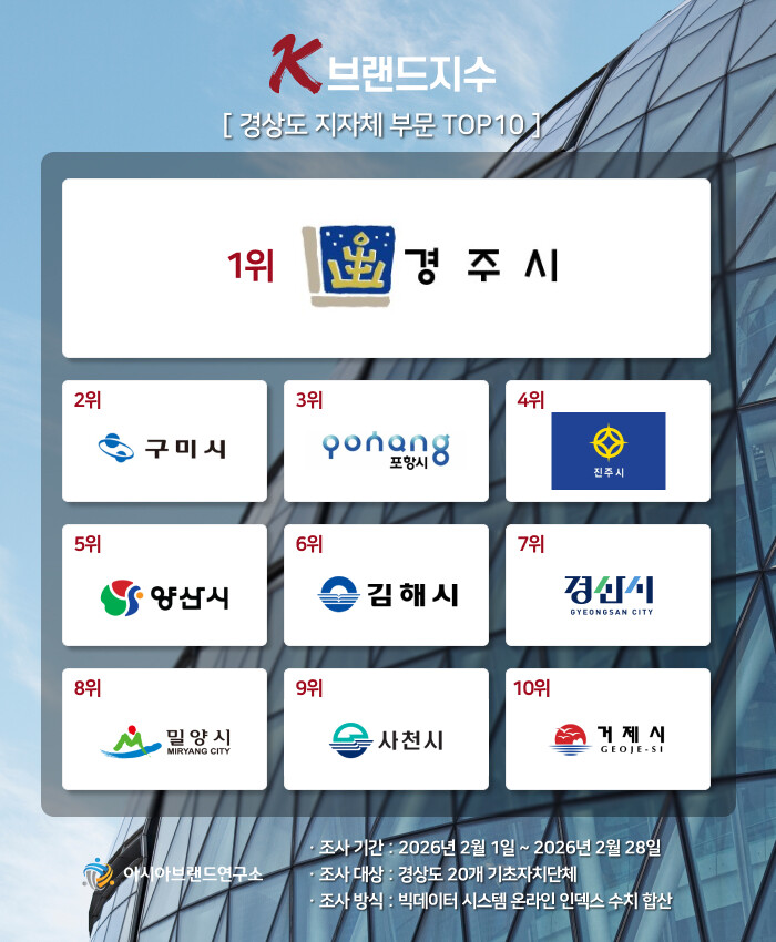 K-브랜드지수 경상도 지자체 부문은 경주시가 1위에 등극했으며, 구미시(2위), 포항시(3위), 진주시(4위), 양산시(5위), 김해시(6위), 경산시(7위), 밀양시(8위), 사천시(9위), 거제시(10위) 등이 TOP10에 이름을 올렸다.