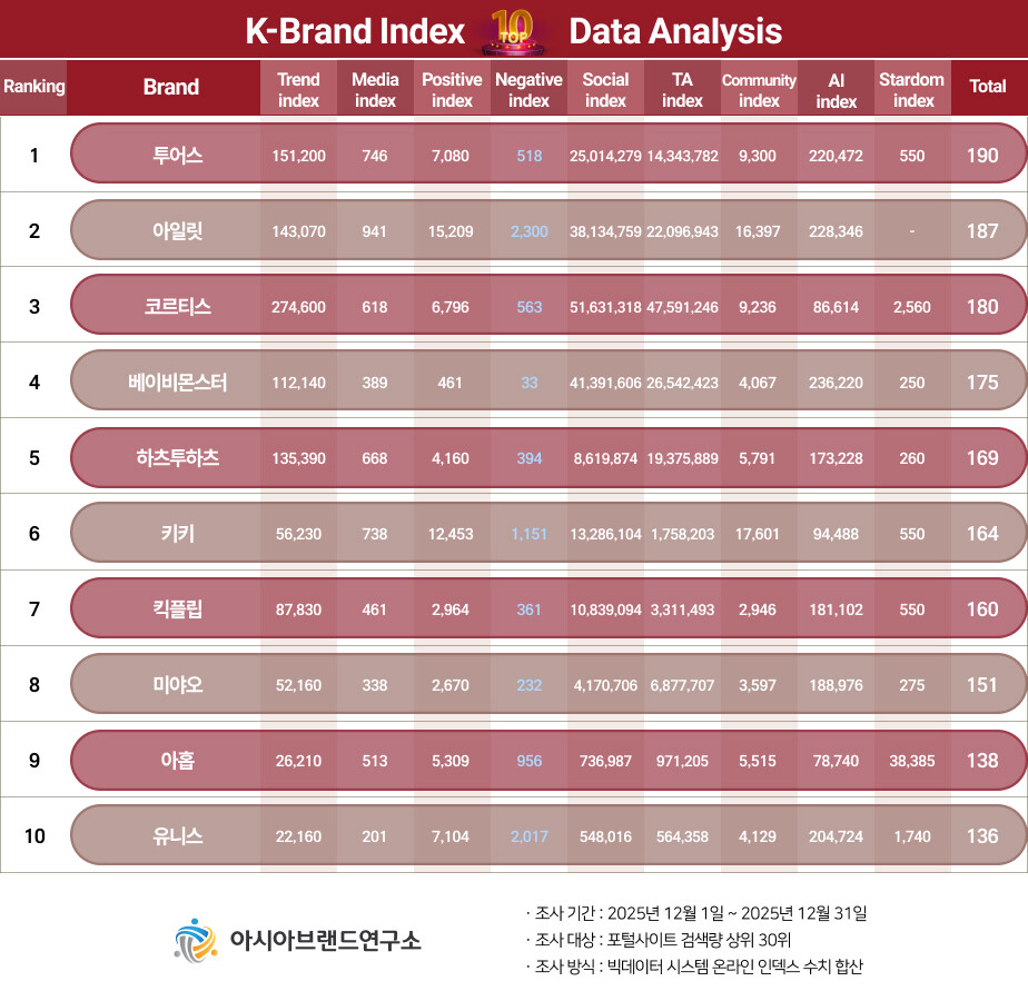 류원선 아시아브랜드연구소 리서치센터장은 “이번 K-브랜드지수 루키 아이돌 부문은 K-팝의 미래를 책임질 '5세대 주자'들의 판도를 가늠할 수 있는 핵심 지표로 평가된다. 영예의 1위를 차지한 투어스는 대중적인 음악과 청량한 콘셉트가 빅데이터상에서 긍정적인 반응을 이끌어냈으며, 2위에 등극한 아일릿 역시 독보적인 스타일로 강력한 팬덤을 구축한 것이 순위에 반영됐다"고 평가했다.