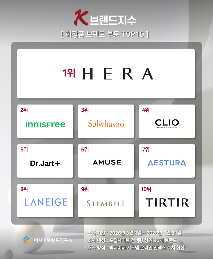 K-브랜드지수 화장품 브랜드 부문은 1위 헤라에 이어 이니스프리(2위), 설화수(3위), 클리오(4위), 닥터자르트(5위), 어뮤즈(6위), 에스트라(7위), 라네즈(8위), 스템벨(9위), 티르티르(10위) 등이 TOP10에 이름을 올렸다.