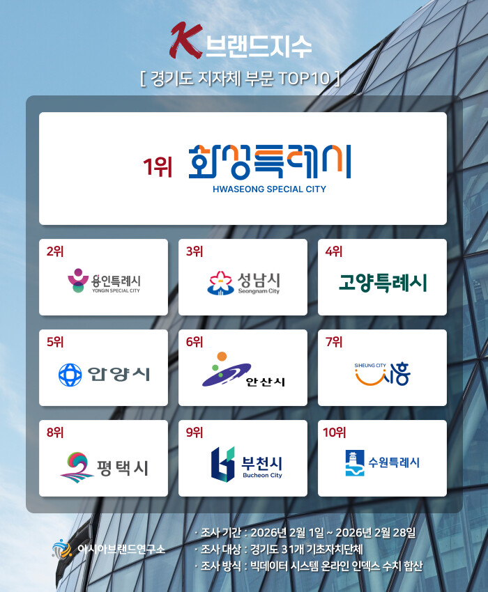 한정근 아시아브랜드연구소 대표는 “이번 K-브랜드지수는 경기 남부권 신흥 경제 도시들의 맹렬한 약진과 전통 강호들의 고전이 강렬하게 충돌한 결과로 풀이된다. 부동의 1위를 수성한 화성시는 압도적인 미래 산업 동력을 기반으로 한 시정 기대감이 빅데이터상 높은 긍정 수치로 이어지며 명실상부한 새로운 '경기 1번지'로서의 위상을 증명했다"고 분석했다.