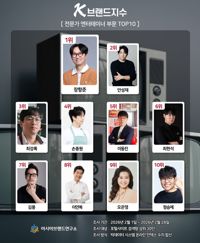 이번 K-브랜드지수는 인문·과학·심리·문화·요리 등에서 활동히는 전문가 엔터테이너 중 포털사이트 검색량 상위 30인을 대상으로, 2026년 2월 1일부터 2월 28일까지의 온라인 빅데이터 1억 9322만 8085건을 분석했다.