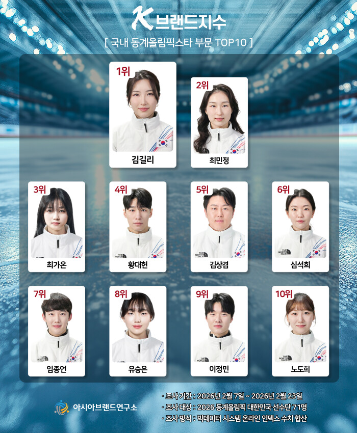 ‘K-브랜드지수’ 동계올림픽스타 부문은 1위 김길리(쇼트트랙)에 이어 2위 최민정(쇼트트랙), 3위 최가온(스노보드), 4위 황대헌(쇼트트랙), 5위 김상겸(스노보드), 6위 심석희(쇼트트랙), 7위 임종언(쇼트트랙), 8위 유승은(스노보드), 9위 이정민(쇼트트랙), 10위 노도희(쇼트트랙) 등이 TOP10에 이름을 올렸다.