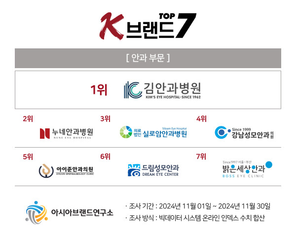 ‘K-브랜드 톱7’ 안과 부문은 지난번에 이어 김안과병원이 1위를 수성한 가운데, 2위 누네안과병원, 3위 실로암안과병원, 4위 강남성모안과의원, 5위 아이준안과의원, 6위 드림성모안과의원, 7위 밝은세상안과의원 등이 상위권의 영예를 안았다.