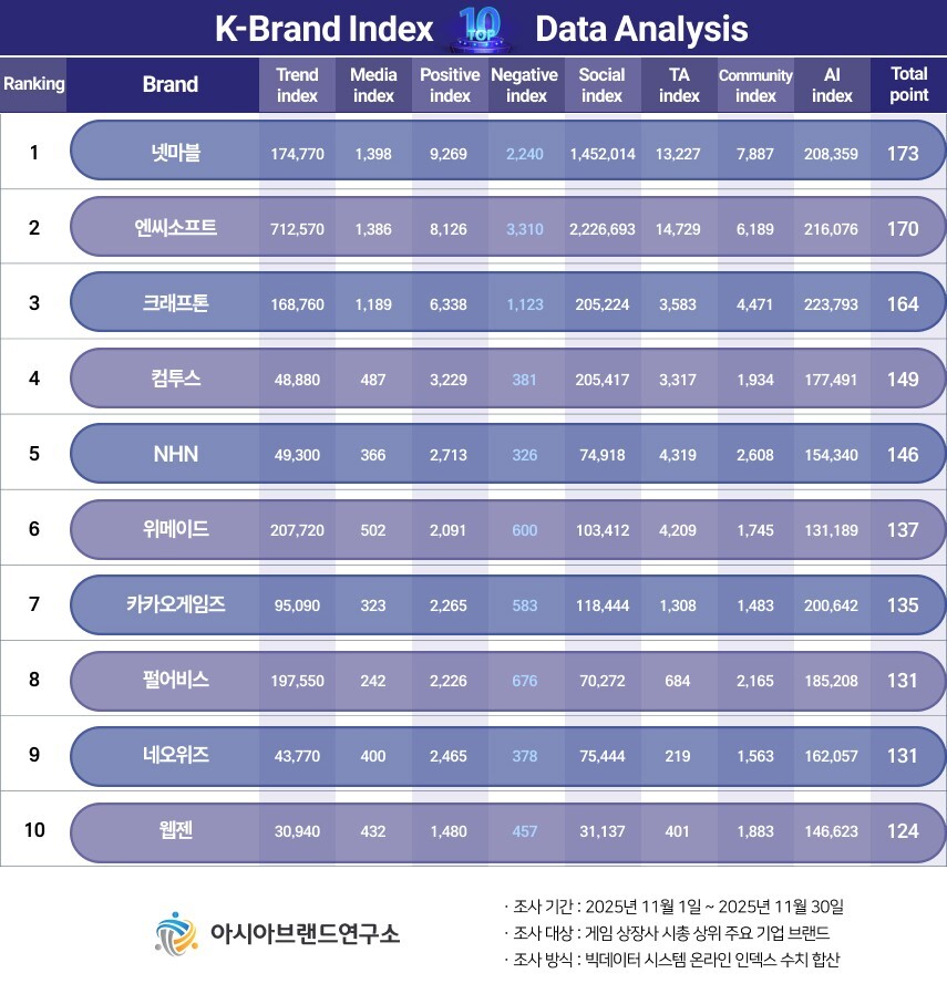 K-브랜드지수 게임 상장사 부문은 1위 넷마블에 이어 엔씨소프트(2위), 크래프톤(3위), 컴투스(4위), NHN(5위), 위메이드(6위), 카카오게임즈(7위), 펄어비스(8위), 네오위즈(9위), 웹젠(10위) 등이 TOP10에 이름을 올렸다.
