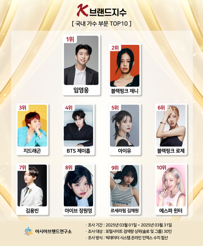K-브랜드지수 국내 가수 부문은 임영웅이 1위에 등극한 가운데, 이어 2위 제니(블랙핑크), 3위 지드래곤, 4위 제이홉(BTS), 5위 아이유, 6위 로제(블랙핑크), 7위 김용빈, 8위 장원영(아이브), 9위 김채원(르세라핌), 10위 윈터(에스파)가 TOP10의 영예를 차지했다.