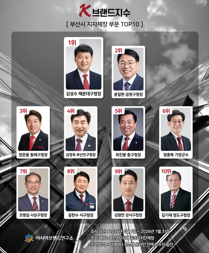 이번 K-브랜드지수 부산시 지자체장 부문은 부산시 16개 기초자치단체장을 대상으로, 2026년 1월 1일부터 1월 31일까지의 온라인 빅데이터 12만 5765건을 분석했다.