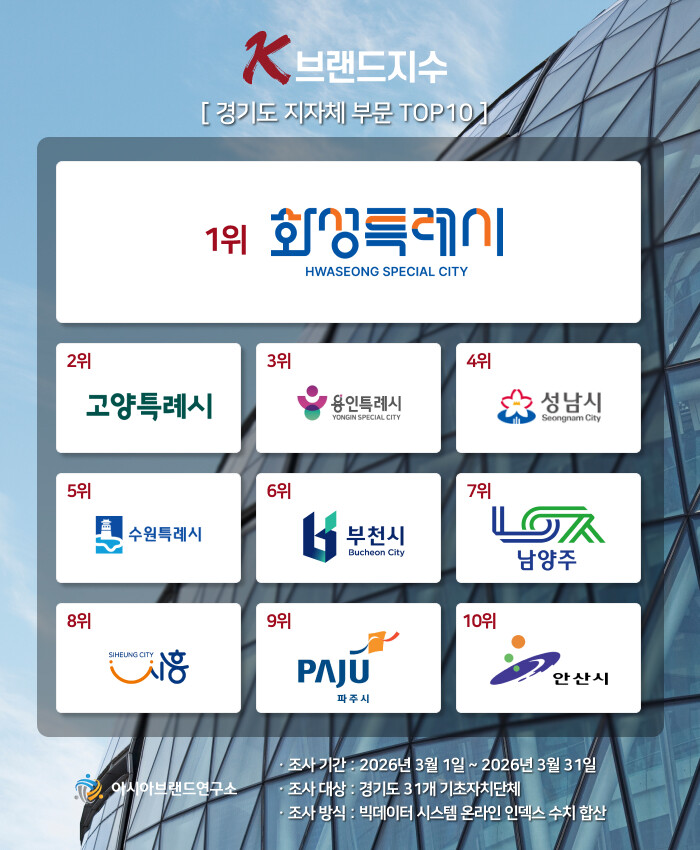 빅데이터 평가 기관인 아시아브랜드연구소는 'K-브랜드지수' 경기도 지자체 부문 1위에 화성시(시장 정명근)가 선정됐다고 1일 발표했다.