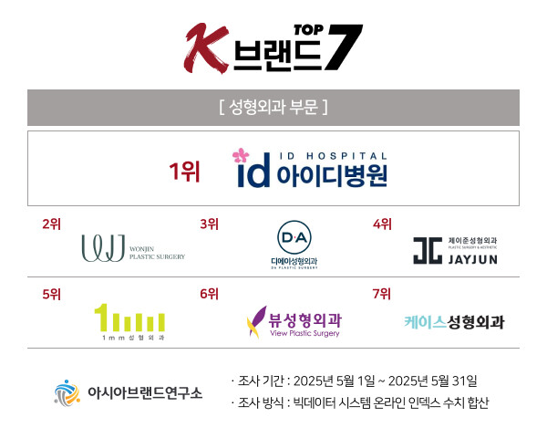 이번 ‘K-브랜드 톱7’ 성형외과 부문은 아이디병원이 1위의 영예를 차지했으며, 2위 원진성형외과의원, 3위 디에이성형외과의원, 4위 제이준성형외과의원, 5위 일미리성형외과의원, 6위 뷰성형외과의원, 7위 케이스성형외과 등이 상위권에 이름을 올렸다.