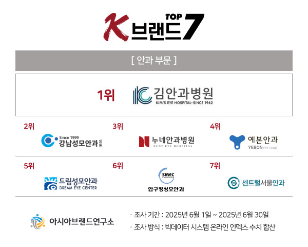 이번 ‘K-브랜드 톱7’ 안과 부문은 김안과병원이 영예의 1위에 등극했으며, 2위 강남성모안과의원, 3위 누네안과병원, 4위 예본안과의원, 5위 드림성모안과의원, 6위 압구정성모안과의원, 7위 센트럴서울안과의원 등이 상위권을 차지했다.