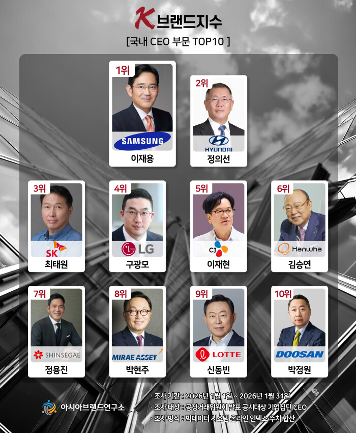 한정근 아시아브랜드연구소 대표는 “이번 K-브랜드지수 CEO 부문은 글로벌 복합 위기 속에서 '미래 성장 동력'을 확보한 리더들에게 대중의 신뢰가 쏠리고 있음을 보여준다. 이재용, 정의선, 최태원 회장이 견고한 3강 체제를 구축한 가운데, 구광모 LG 회장이 4위로 도약한 것은 AI와 바이오 등 신사업 포트폴리오 강화가 빅데이터상 긍정적인 수치로 연결된 결과"라고 평가했다.