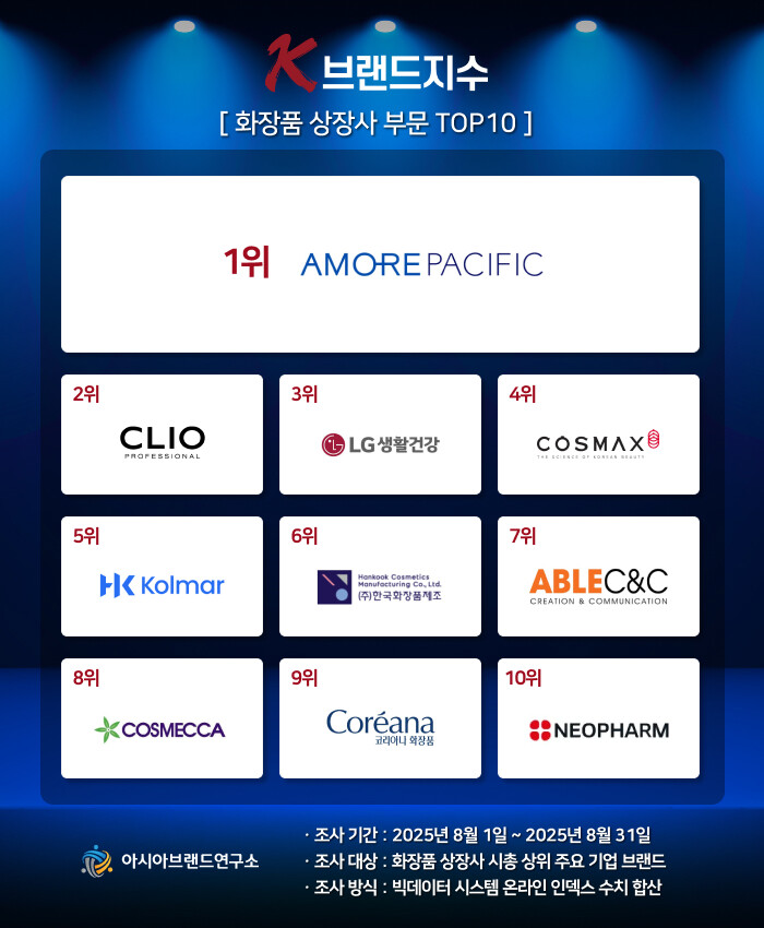 K-브랜드지수 화장품 상장사 부문은 1위 아모레퍼시픽에 이어 클리오(2위), LG생활건강(3위), 코스맥스(4위), 한국콜마(5위), 한국화장품(6위), 에이블씨엔씨(7위), 코스메카코리아(8위), 코리아나(9위), 네오팜(10위)이 TOP10을 차지했다.
