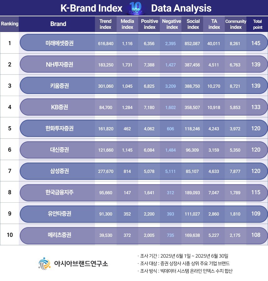 이번 K-브랜드지수 증권 상장사 부문은 증권 상장사 시총 상위 주요 기업 브랜드를 대상으로, 2025년 6월 1일부터 6월 30일까지의 온라인 빅데이터 585만 9601건을 분석했다.