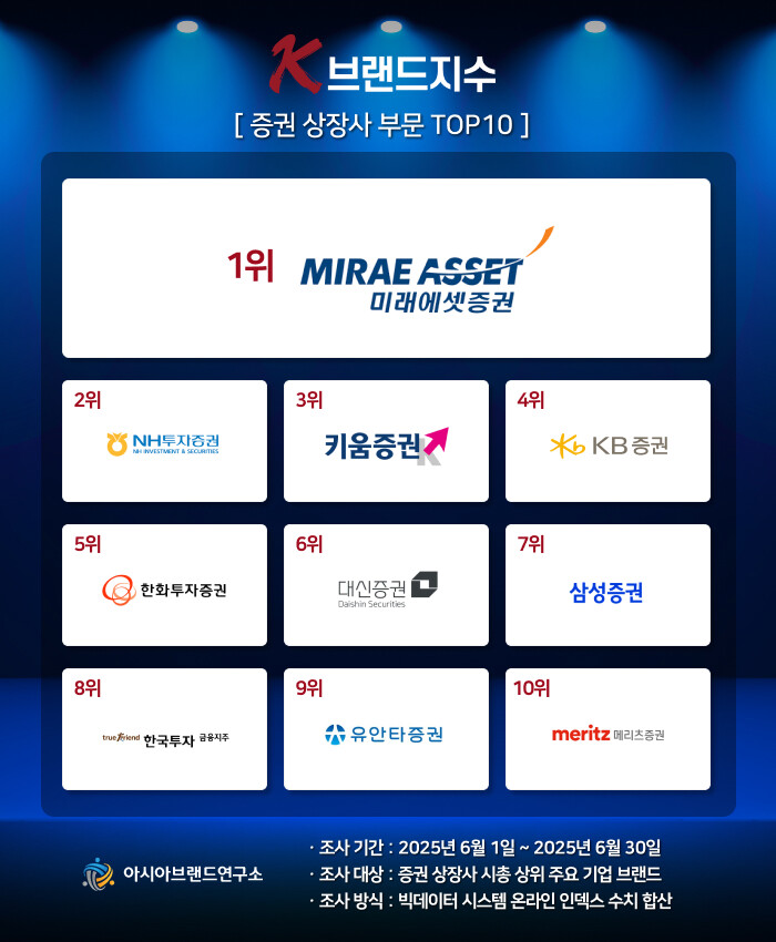 한정근 아시아브랜드연구소 대표는 “올 상반기 증권업계는 금리 변동성과 자본시장 규제 등 복합적인 변수 속에서 기업 특성에 맞춘 성장 전략을 추진하고 있다. 특히 비대면 플랫폼이 브랜드 성패의 핵심 요소로 떠오르며 이용자와의 정서적 연결을 중시하는 흐름이 강화되는 상황”이라고 설명했다.