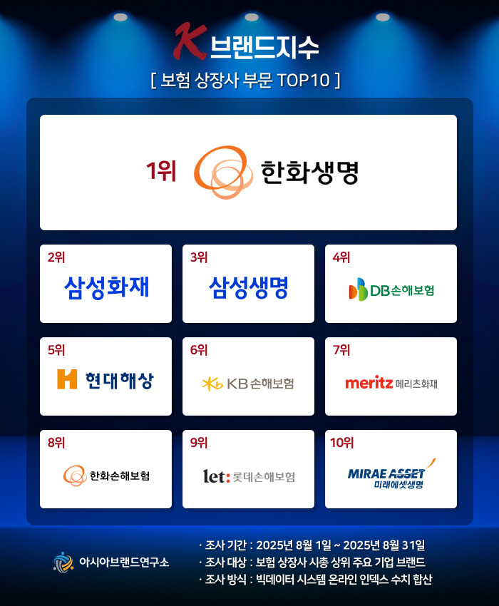 K-브랜드지수 보험 상장사 부문은 한화생명이 1위의 영예를 차지했으며, 삼성화재(2위), 삼성생명(3위), DB손해보험(4위), 현대해상(5위), KB손해보험(6위), 메리츠화재(7위), 한화손해보험(8위), 롯데손해보험(9위), 미래에셋생명(10위)이 TOP10에 이름을 올렸다.