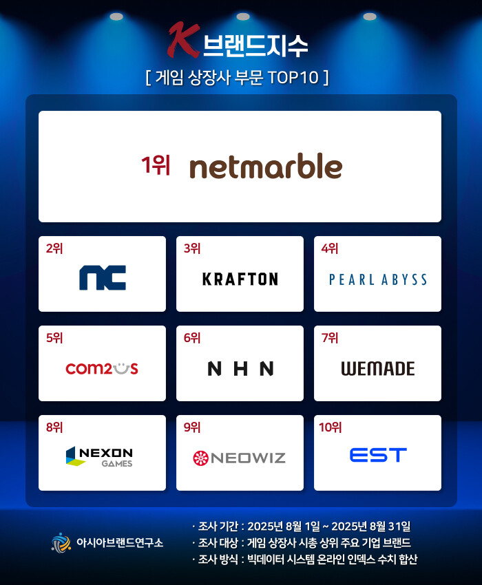 K-브랜드지수 게임 상장사 부문은 넷마블이 1위에 등극한 가운데, 엔씨소프트(2위), 크래프톤(3위), 펄어비스(4위), 컴투스(5위), NHN(6위), 위메이드(7위), 넥슨게임즈(8위), 네오위즈(9위), 이스트소프트(10위)가 TOP10에 이름을 올렸다.