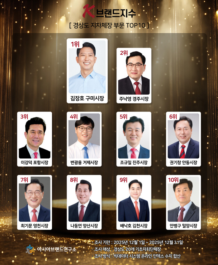 한정근 아시아브랜드연구소 대표는 “이번 K-브랜드지수 올해의 경상도 지자체장 부문은 단기간 이슈보다 누적된 현안 대응과 온라인 노출 흐름이 순위에 반영된 것으로 볼 수 있다. 김장호 구미시장의 1위 등극은 산업·지역 이슈에 대한 지속적 IMC 활동이 실질 효과를 발휘한 것으로 해석된다”라고 설명했다.