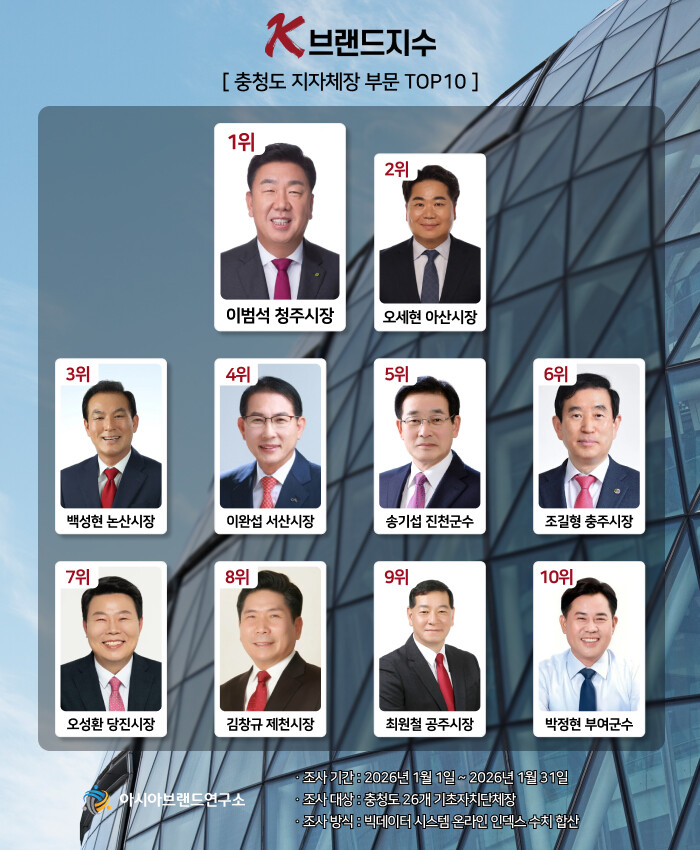 한정근 아시아브랜드연구소 대표는 “2026년 1월 충청도 지자체장 부문 K-브랜드지수는 단체장들의 '신년사'와 '새해 비전'이 지역민들에게 얼마나 설득력 있게 전달됐는지를 보여주는 첫 성적표다.이범석 청주시장의 1위 수성과 오세현 아산시장의 상승세는 연초부터 구체적인 경제 활성화 로드맵을 제시하며 빅데이터상에서 높은 '기대감'을 이끌어냈다"고 분석했다.