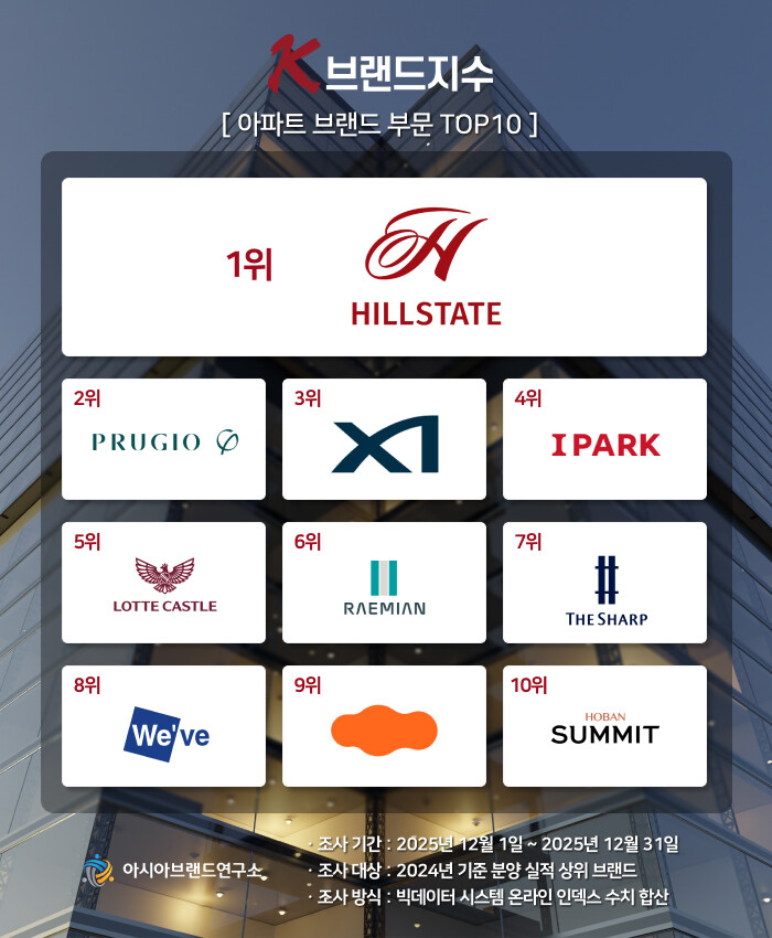K-브랜드지수 아파트 브랜드 부문은 힐스테이트가 1위에 등극했으며, 푸르지오(2위), 자이(3위), 아이파크(4위), 롯데캐슬(5위), 래미안(6위), 더샵(7위), 두산위브(8위), e편한세상(9위), 호반써밋(10위) 등이 TOP10에 이름을 올렸다.