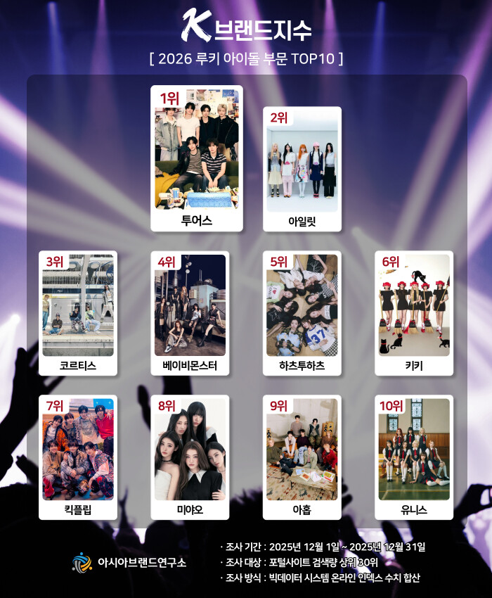류원선 아시아브랜드연구소 리서치센터장은 “이번 K-브랜드지수 루키 아이돌 부문은 K-팝의 미래를 책임질 '5세대 주자'들의 판도를 가늠할 수 있는 핵심 지표로 평가된다. 영예의 1위를 차지한 투어스는 대중적인 음악과 청량한 콘셉트가 빅데이터상에서 긍정적인 반응을 이끌어냈으며, 2위에 등극한 아일릿 역시 독보적인 스타일로 강력한 팬덤을 구축한 것이 순위에 반영됐다"고 평가했다.