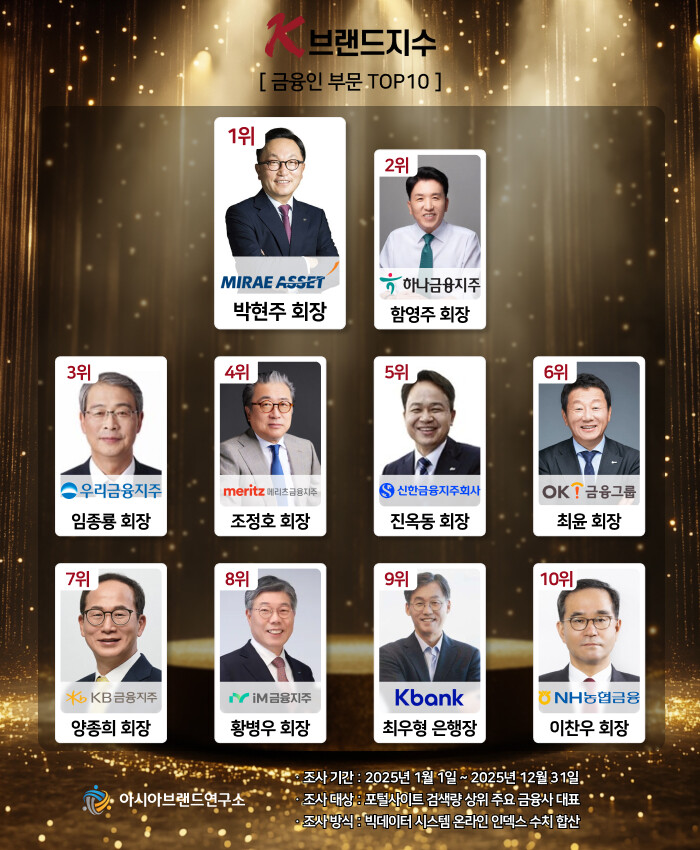 이번 K-브랜드지수 금융인 부문은 포털사이트 검색량 상위 주요 금융사 대표를 대상으로, 2025년 1월 1일부터 12월 31일까지의 온라인 빅데이터 986만 2046건을 분석했다.