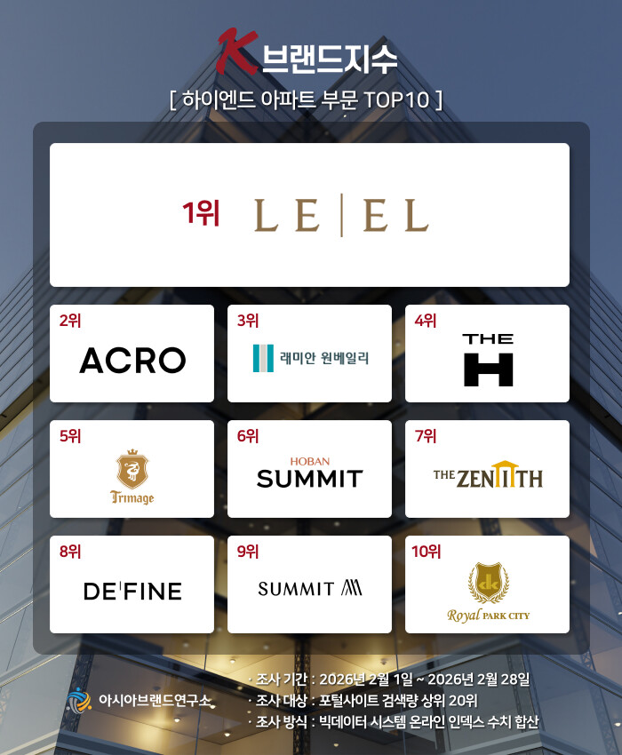 이번 K-브랜드지수 하이엔드 아파트 부문은 포털사이트 검색량 상위 20위를 대상으로, 2026년 2월 1일부터 2월 28일까지의 온라인 빅데이터 219만 164건을 분석했다.