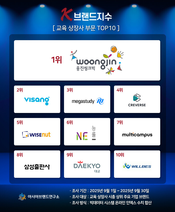 K-브랜드지수 교육 상장사 부문은 웅진씽크빅이 1위를 수성했으며, 비상교육(2위), 메가스터디교육(3위), 크레버스(4위), 와이즈넛(5위), NE능률(6위), 멀티캠퍼스(7위), 삼성출판사(8위), 대교(9위), 윌비스(10위)가 TOP10에 이름을 올렸다.