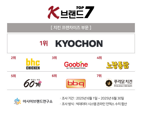 2025년 6월 1일부터 30일까지의 온라인 빅데이터 1584만 5386건을 대상으로 조사된 ‘K-브랜드 톱7’ 치킨 프랜차이즈 부문은 트렌드(Trend)·소셜(Social)·미디어(Media)·커뮤니티(Community)·긍부정(Positive/Negative) 인덱스 등의 핵심 빅데이터에 대한 가중치 배제 합산 수치로 산출됐다.