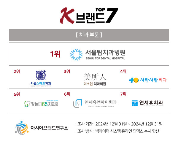 이번 K-브랜드 톱7 치과 부문은 서울탑치과병원이 또 다시 1위를 수성했으며, 2위 서울스마트치과의원, 3위 미소인치과의원, 4위 사람사랑치과의원, 5위 강남365치과의원, 6위 연세유앤아이치과의원, 7위 연세휴치과의원 등이 상위권에 이름을 올렸다.