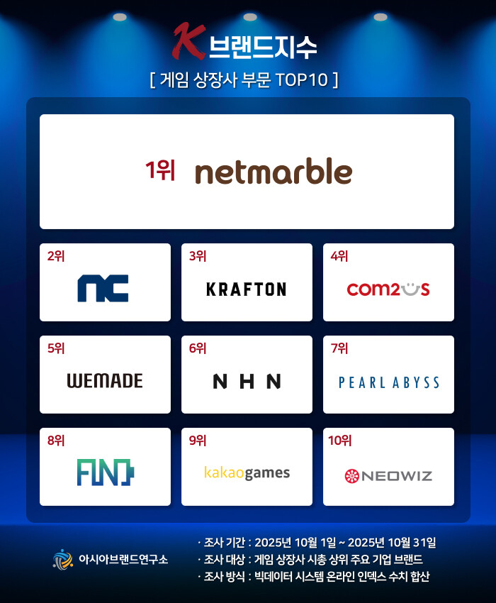 K-브랜드지수 게임 상장사 부문은 넷마블이 1위를 수성했으며, 이어 엔씨소프트(2위), 크래프톤(3위), 컴투스(4위), 위메이드(5위), NHN(6위), 펄어비스(7위), 피노(8위), 카카오게임즈(9위), 네오위즈(10위) 등이 TOP10에 이름을 올렸다.