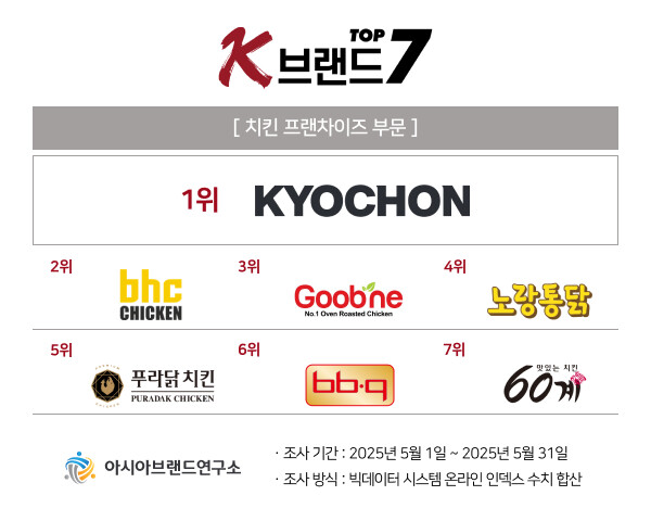 특히, ‘K-브랜드 톱7’ 치킨 프랜차이즈 부문은 2025년 5월 1일부터 31일까지의 온라인 빅데이터 1550만 3153건을 대상으로 진행됐다.