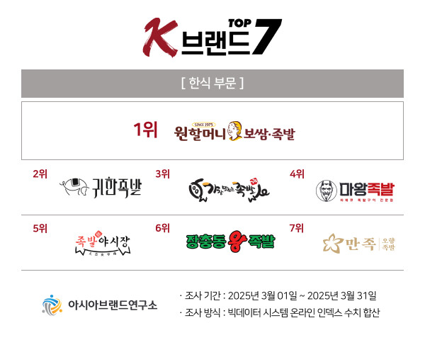 이번 ‘K-브랜드 톱7’ 한식 부문은 원할머니보쌈이 1위에 등극한 가운데, 2위 귀한족발, 3위 가장맛있는족발, 4위 마왕족발, 5위 족발야시장, 6위 장충동왕족발, 7위 만족오향족발이 상위권의 영예를 차지했다.