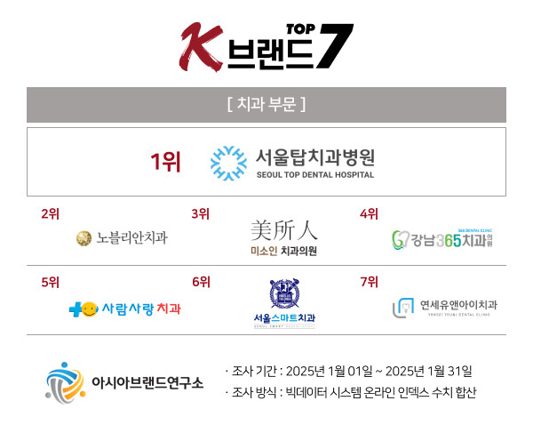 아시아브랜드연구소 - ‘K-브랜드 톱7’ 치과 1위 서울탑치과, 노블리안·미소인·강남365·사람사랑 뒤이어
