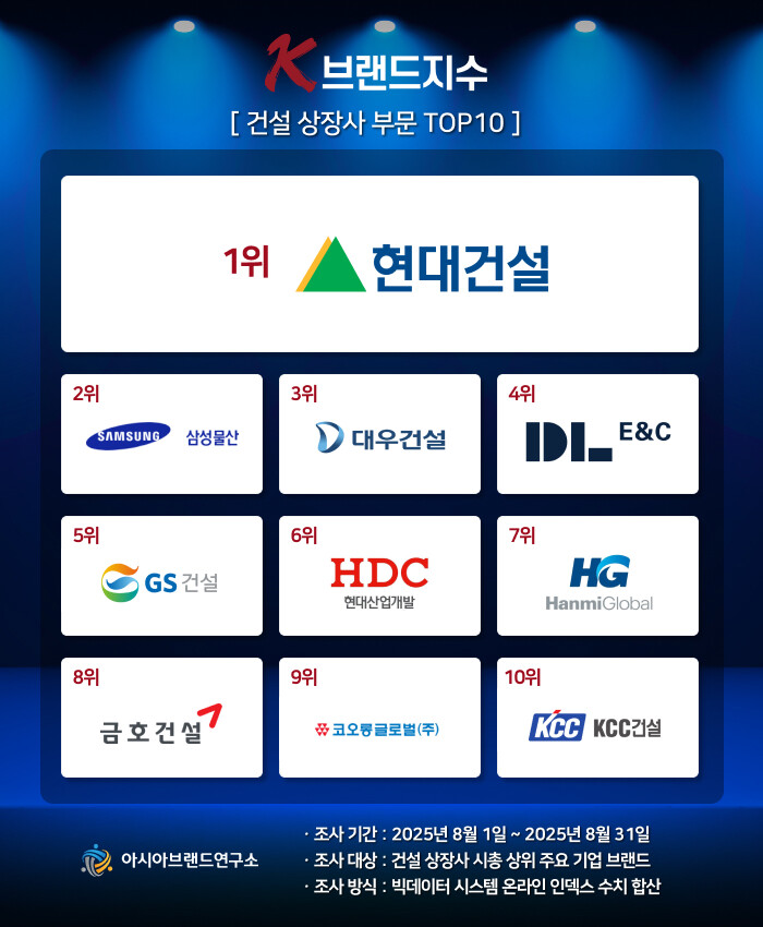 한정근 아시아브랜드연구소 대표는 “최근 정부의 주택 공급 확대 정책과 해외 인프라 투자 수요가 동시에 늘어나며 건설업계 브랜드 경쟁력이 강화되고 있다. 특히 대형사 중심의 안정적 실적 외에도 중견 건설사의 해외시장 진출과 스마트 건축 프로젝트가 주목받으며 브랜드 이미지 제고에 긍정적인 흐름을 보이고 있다”고 분석했다.