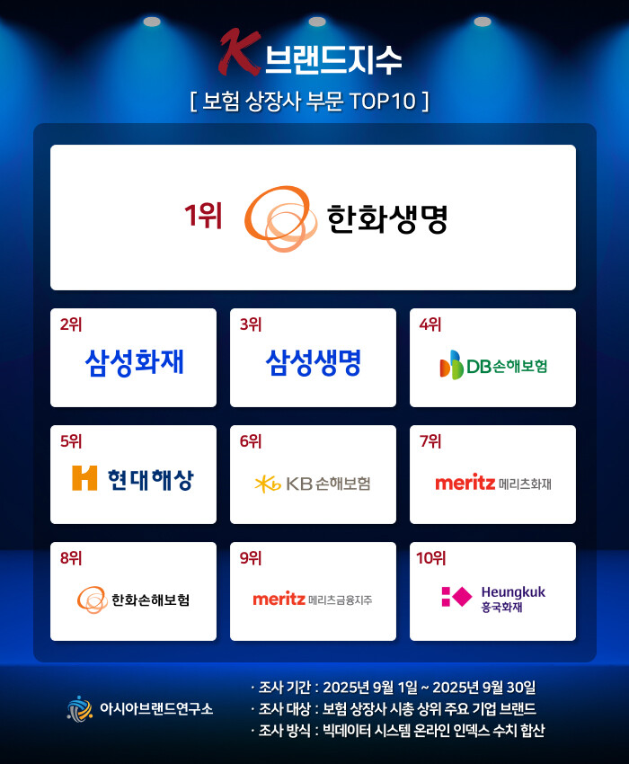 K-브랜드지수 보험 상장사 부문은 1위 한화생명에 이어 삼성화재(2위), 삼성생명(3위), DB손해보험(4위), 현대해상(5위), KB손해보험(6위), 메리츠화재(7위), 한화손해보험(8위), 메리츠금융지주(9위), 흥국화재(10위)가 TOP10에 이름을 올렸다.