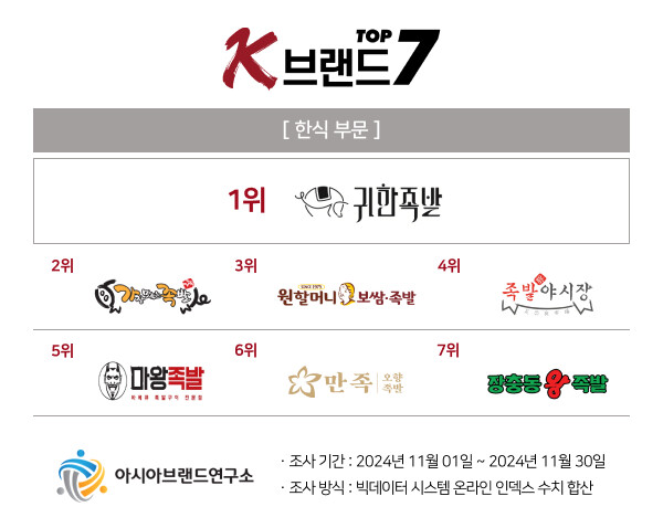 이번 ‘K-브랜드 톱7’ 한식 부문은 귀한족발이 1위의 영예를 차지했으며, 2위 가장맛있는족발, 3위 원할머니보쌈 4위 족발야시장, 5위 마왕족발, 6위 만족오향족발, 7위 장충동왕족발 등이 상위권에 이름을 올렸다.