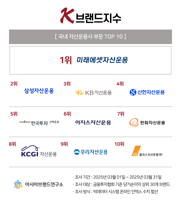 K-브랜드지수 자산운용사 부문은 미래에셋자산운용이 1위에 등극한 가운데, 삼성자산운용(2위), KB자산운용(3위), 신한자산운용(4위), 한국투자신탁운용(5위), 이지스자산운용(6위), 한화자산운용(7위), KCGI자산운용(8위), 우리자산운용(9위), 플러스자산운용(10위) 등이 TOP10에 이름을 올렸다.