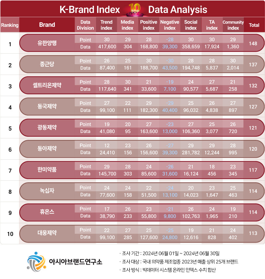 국가대표 브랜드를 표방하는 K-브랜드지수는 아시아브랜드연구소가 국내외 연구진과 협력해 개발한 빅데이터 시스템으로, 이를 기반으로 산출된 제약사 부문은 2024년 6월 1일부터 30일까지의 온라인 빅데이터 4,662,911건을 분석했다.