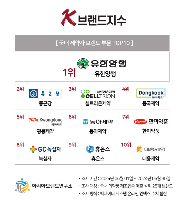아시아브랜드연구소 - ‘K-브랜드지수’ 제약사 부문 TOP10 발표···유한양행 이어 종근당·셀트리온제약