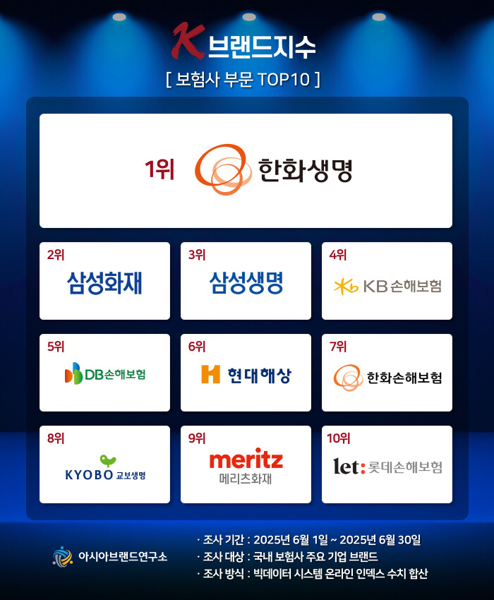 아시아브랜드연구소 - 한화생명부터 롯데손보까지…‘K-브랜드지수’ 보험사 부문 TOP10 발표