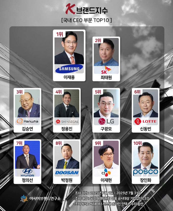 이번 K-브랜드지수 CEO 부문은 공정거래위원회 발표 공시대상 기업집단 CEO를 대상으로, 2025년 7월 1일부터 7월 31일까지의 온라인 빅데이터 1억 9071만 1471건을 분석했다.