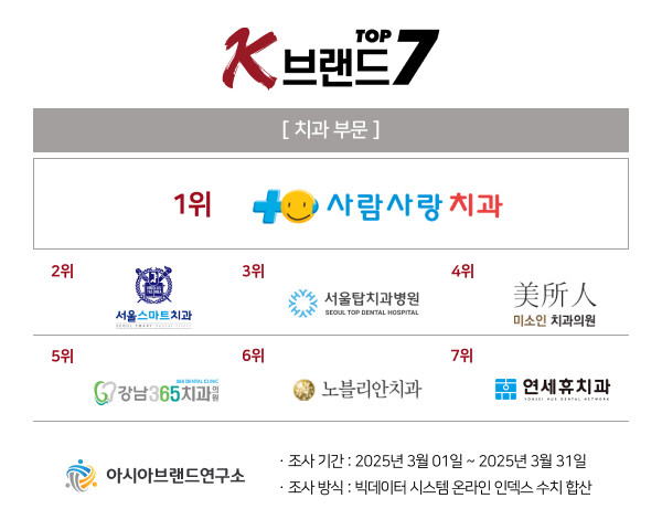 빅데이터 평가 기관인 아시아브랜드연구소는 'K-브랜드 톱7' 치과 부문 1위에 사람사랑치과의원이 선정됐다고 21일 발표했다.
