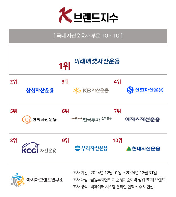 K-브랜드지수 자산운용사 부문은 미래에셋자산운용이 또 다시 1위를 수성했으며, 삼성자산운용(2위), KB자산운용(3위), 신한자산운용(4위), 한화자산운용(5위), 한국투자신탁운용(6위), 이지스자산운용(7위), KCGI자산운용(8위), 우리자산운용(9위), 현대자산운용(10위)이 TOP10의 영예를 차지했다.