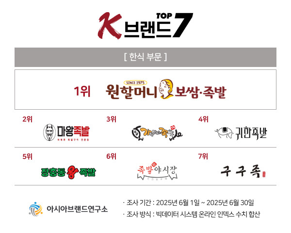 이번 ‘K-브랜드 톱7’ 한식 부문은 원할머니보쌈이 1위를 수성했으며, 2위 마왕족발, 3위 가장맛있는족발, 4위 귀한족발, 5위 장충동왕족발, 6위 족발야시장, 7위 구구족 등이 상위권에 이름을 올렸다.
