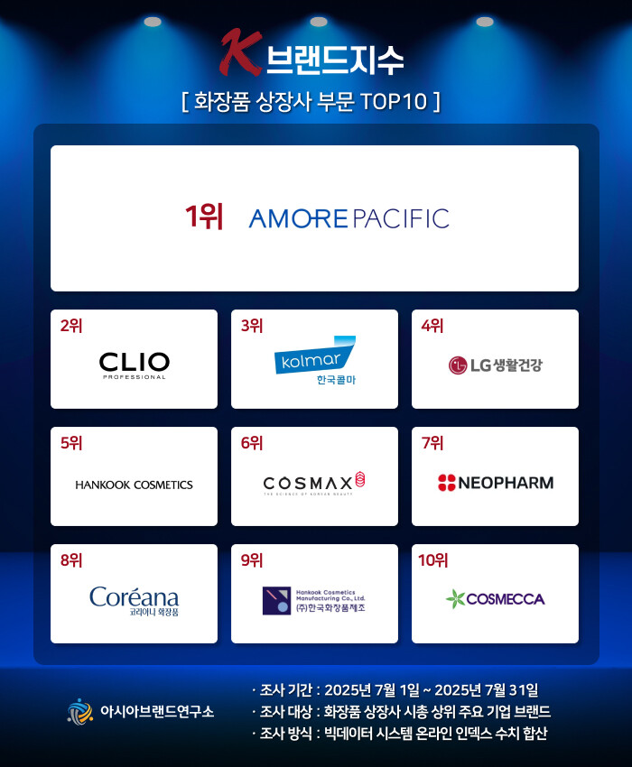 K-브랜드지수 화장품 상장사 부문은 아모레퍼시픽이 1위를 수성했으며, 클리오(2위), 한국콜마(3위), LG생활건강(4위), 한국화장품(5위), 코스맥스(6위), 네오팜(7위), 코리아나(8위), 한국화장품제조(9위), 코스메카코리아(10위) 등이 TOP10에 이름을 올렸다.