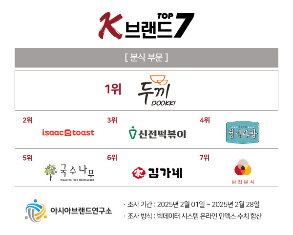 이번 ‘K-브랜드 톱7’ 분식 부문은 두끼가 1위의 영예를 차지했으며, 2위 이삭토스트 3위 신전떡볶이, 4위 청년다방, 5위 국수나무, 6위 김가네, 7위 삼첩분식 등이 상위권에 이름을 올렸다.