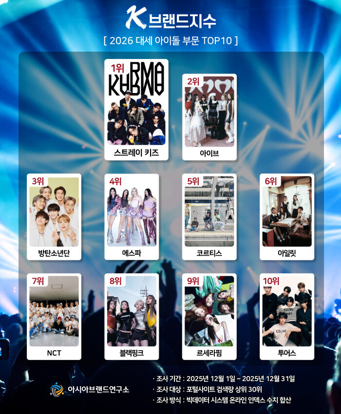류원선 아시아브랜드연구소 리서치센터장은 “K-브랜드지수 대세 아이돌 부문은 전 세계 대중문화의 중심이 된 K-팝의 현재 주소를 보여주는 지표다. 1위를 차지한 스트레이 키즈를 비롯한 아이브, 에스파 등은 단순한 음악 활동을 넘어, 거대 팬덤(Fandom)을 기반으로 한 강력한 문화적 영향력을 행사하고 있다. 이는 빅데이터상에서 압도적인 언급량과 긍정적인 버즈(Buzz)로 직결되는 중"이라고 분석했다.