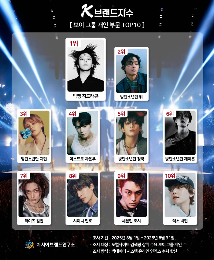 K-브랜드지수 보이 그룹 개인 부문은 빅뱅 지드래곤이 1위를 수성한 가운데, 방탄소년단 뷔(2위), 방탄소년단 지민(3위), 아스트로 차은우(4위), 방탄소년단 정국(5위), 방탄소년단 제이홉(6위), 라이즈 원빈(7위), 샤이니 민호(8위), 세븐틴 호시(9위), 엑소 백현(10위) 등이 TOP10의 영예를 안았다.